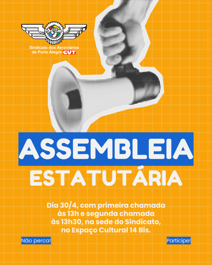 O Sindicato dos Aeroviários de Porto Alegre convoca todos os seus aposentados para assembleia estatutária, na quinta-feira (30), com primeira chamada às 13h e segunda chamada às 13h30, na sede (R. Augusto Severo, 82 – São João, Porto Alegre). O evento acontece no Espaço Cultural 14 Bis, no segundo piso do Sindicato e toda categoria está convidada a participar desse encontro que pode modificar o estatuto da entidade.