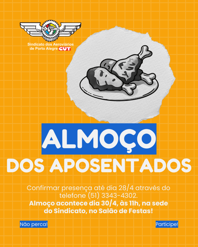 Além da assembleia que deve definir os próximos anos da entidade, o tradicional Almoço dos Aposentados também acontece no mesmo dia, as 11h, mas no espaço do Salão de Festas. Com galeto, salsichão e guarnições sendo servidas, o encontro promove o reencontro de colegas do tempo de Varig e TAP ME.